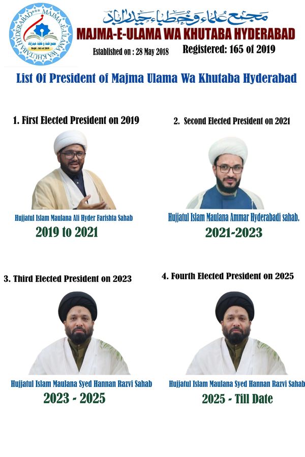 MAJMA -E- ULAMA WA KHUTABA –E- HYDERABAD was formed in the year 2018 vide Regd no 165/2019 the founder and the first president of said committee was Hujjatul islam Maulana Ali Hyder Farishta Sahab Qibla the mission and motive of the organization is protecting the of SHIA Muslims around the world.